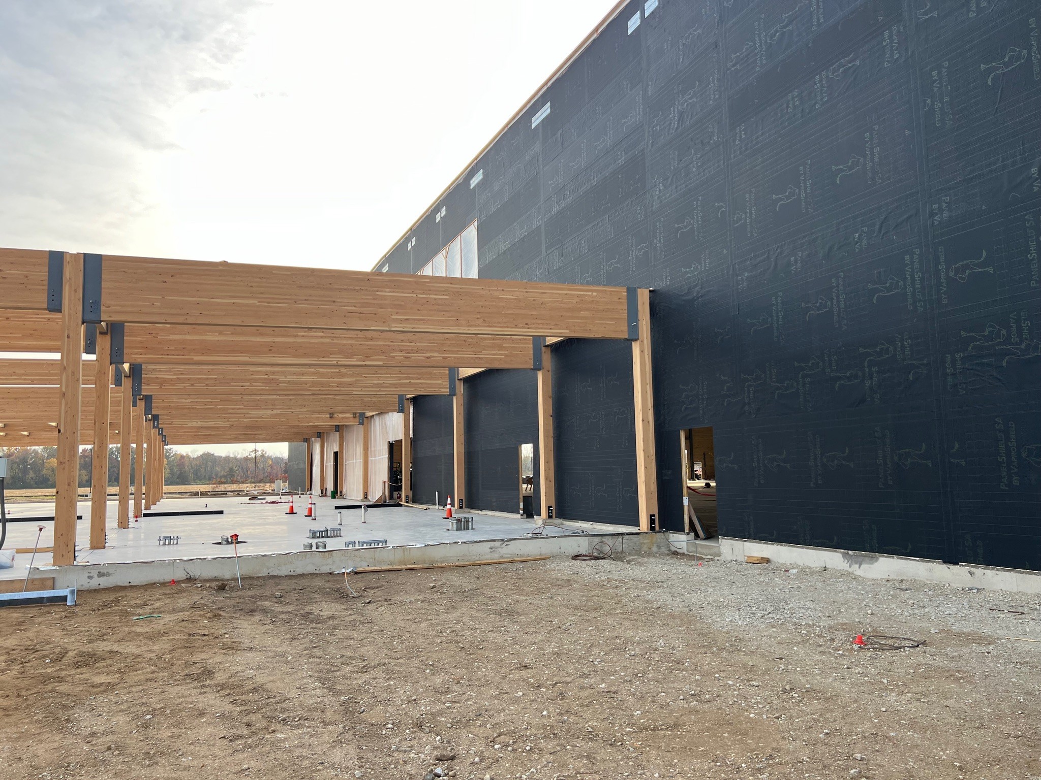 The Amazon DII5 delivery station features a mass timber structure including glulam beams and cross-laminated timber panels, creating a low-carbon, sustainable facility. Over 75,000 sq.ft. of PanelShield SA was installed on the mass timber walls to provide a fully adhered, vapor-permeable air barrier. An additional 60,000 sq.ft. of SlopeShield Plus SA was installed on the awnings of the facility.