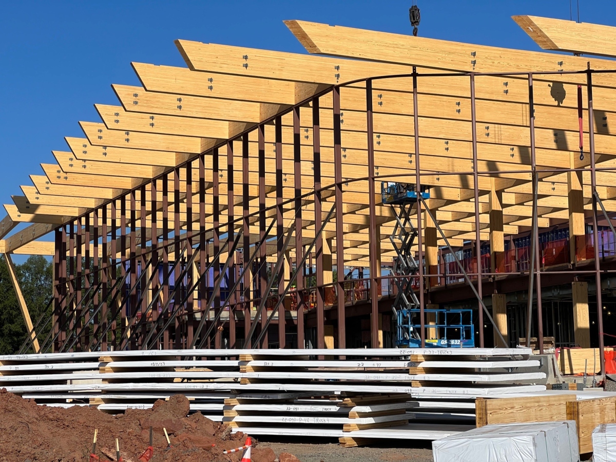As part of Micron’s expansion at its Manassas, VA plant, the new mass timber building is constructed out of glulam posts and beams, as well as glulam branches around the perimeter. Protecting the expansive mass timber roof from moisture infiltration is over 60,000 sq.ft. of VaproShield’s SlopeShield Plus SA air barrier and permeable vapor retarder membrane. SlopeShield Plus SA protects the mass timber from bulk water intrusion and concurrently dries mass timber through moisture vapor diffusion. Once the mass timber dries, it will not get wetter and the mass timber deck is protected from future rain events. SlopeShield Plus SA is extremely durable to foot traffic and heavy equipment, it can withstand 180 days of UV and climate exposure, helping contractors stay on schedule despite inclement weather events.