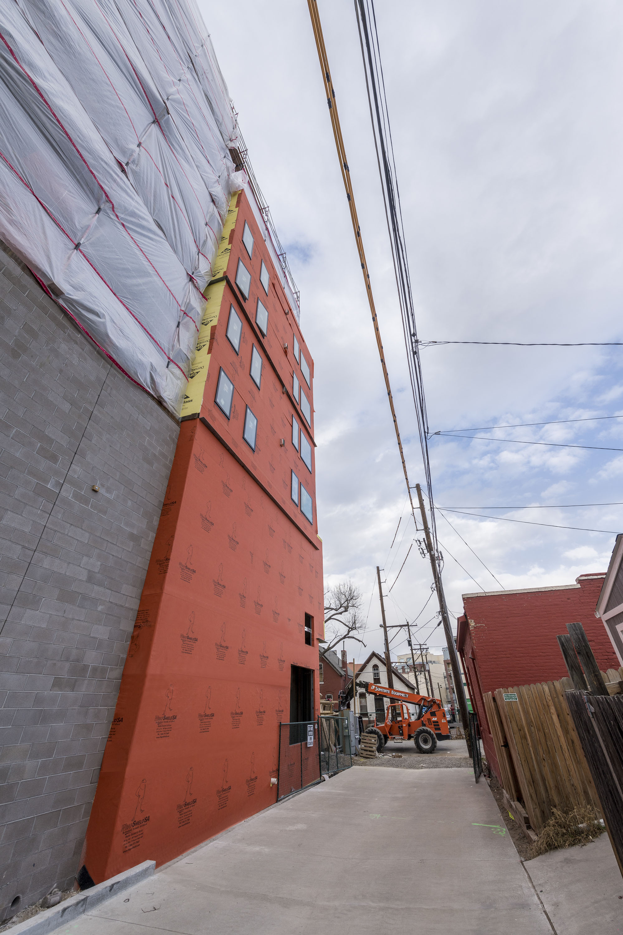WrapShield SA Self-Adhered WRB/Air Barrier (orange) installed on The Lydian in Denver, Colorado.
