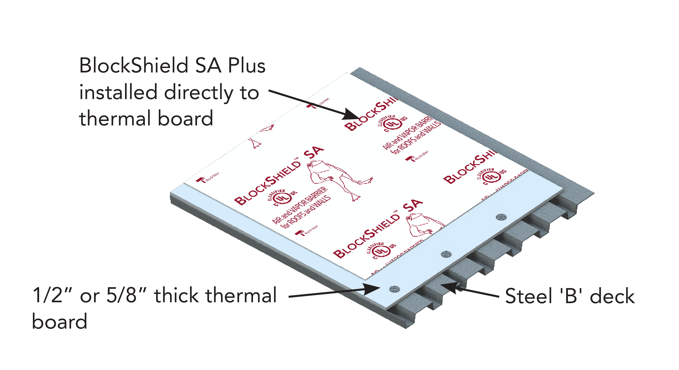 BlockShield SA Plus is typically installed on the warm side, below rigid foam insulation in a compact insulated roof deck.