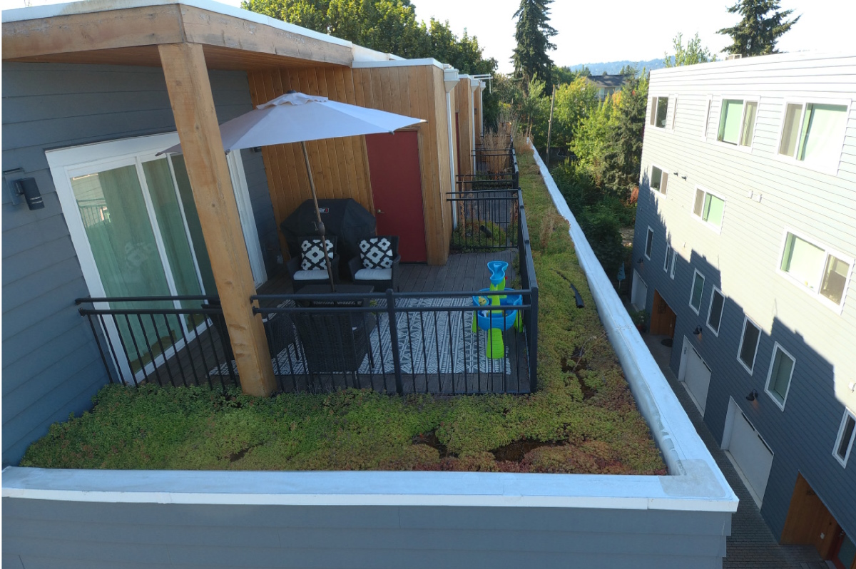 Overburdened roofing, consisting of a combination of 4-5” of growing medium, roof top decks and railings.